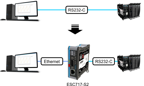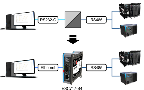 Neste exemplo há um computador com um sistema de supervisão, e utilizando um conversor RS232-C / RS485, acessa diversos equipamentos no chão de fábrica através de uma rede RS485. Nesta arquitetura, utilizando o ESC717-S4, o sistema de supervisão pode acessar qualquer um dos equipamentos no chão de fábrica através da rede Ethernet.